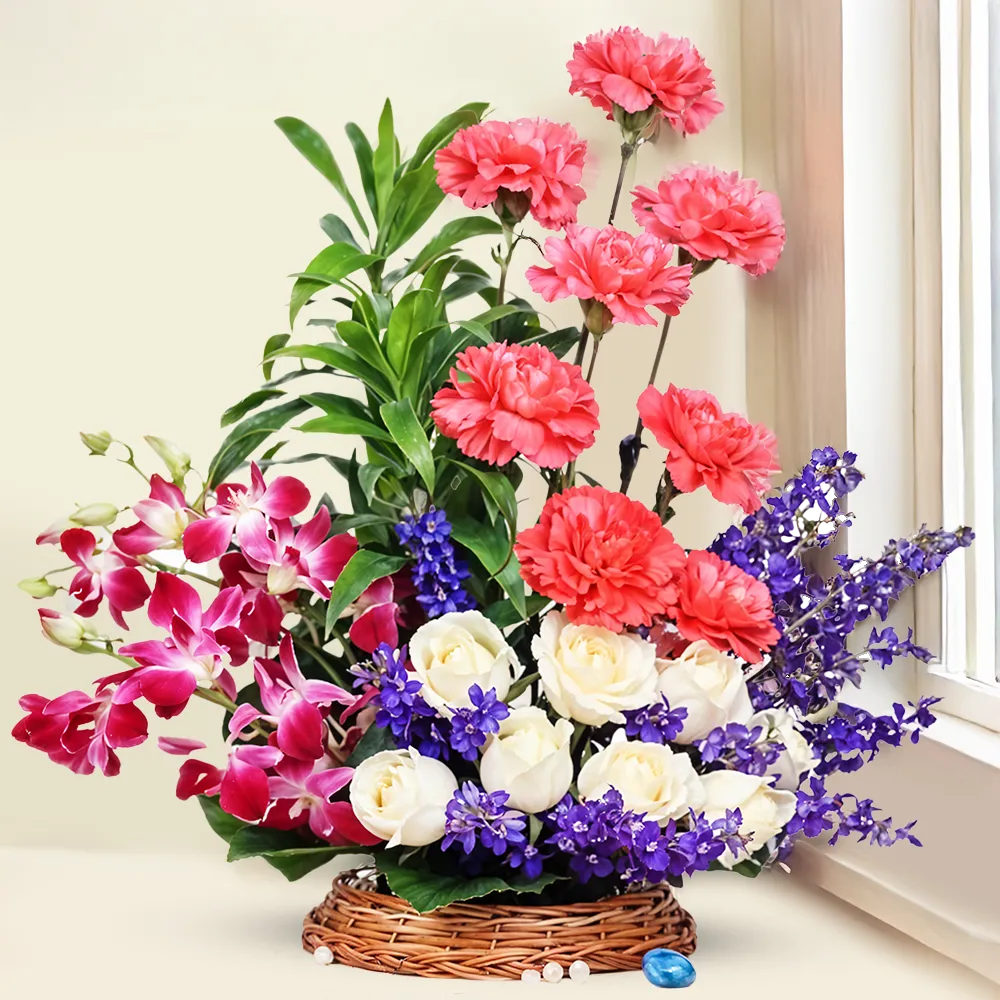 A Product With 8 Pink Carnations8 White Roses5 Purple OrchidsWith Seasonal Fillers Nicely Arrange in a BasketWith a Ribbon Bow