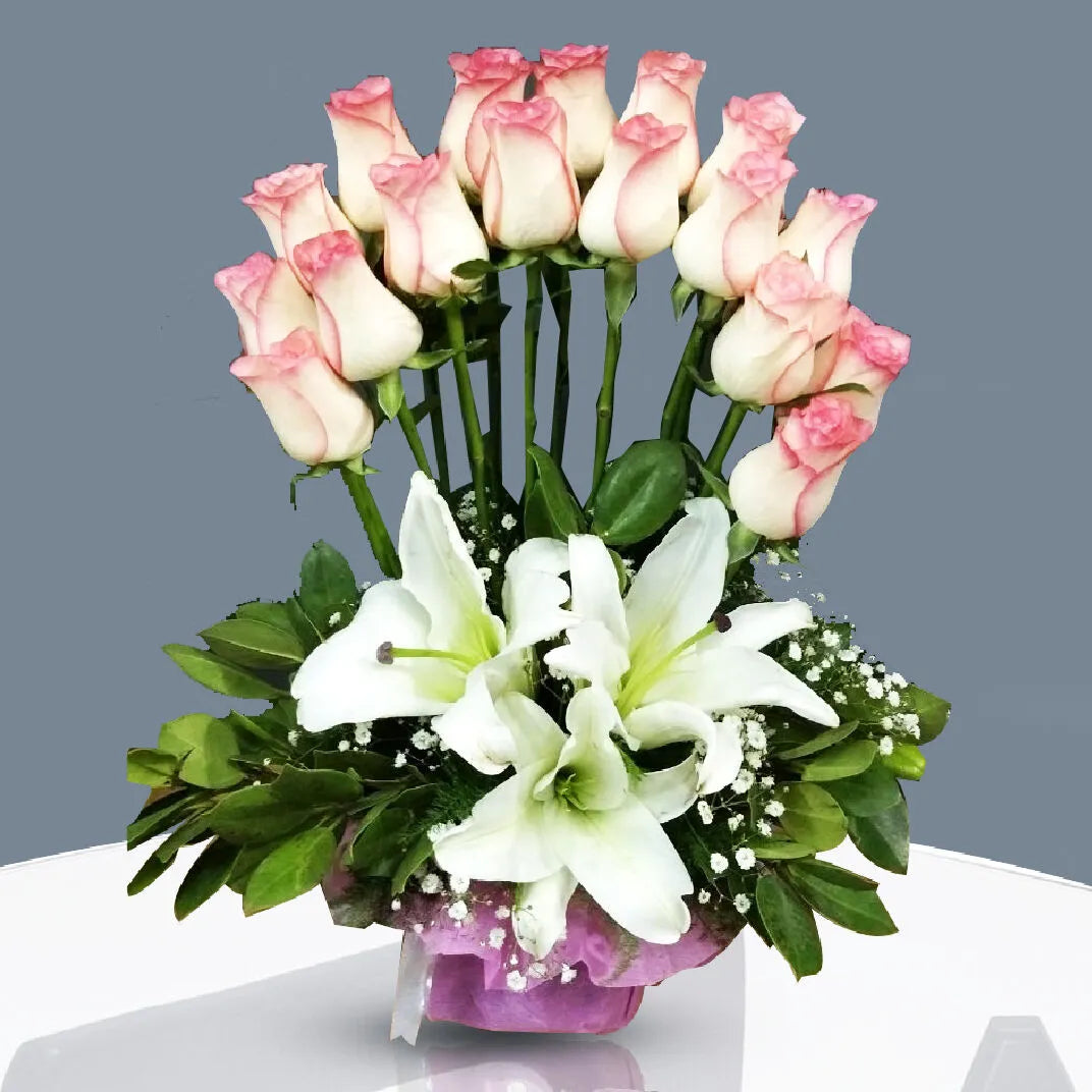 A Product With3 White Lily20 Pink Roses With Seasonal FillersNicely Arranged in a Glass VaseWith White Ribbon Bow